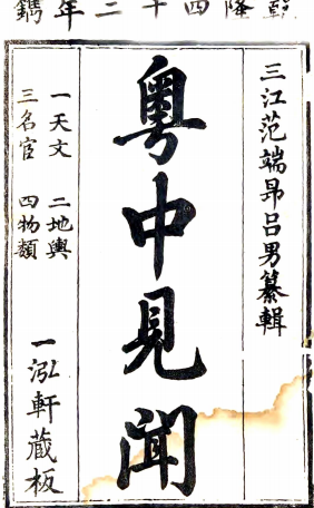 书名: 粤中见闻三十五卷附纪一卷(清)范端昂纂輯 清乾隆四十二年(1777)刻本