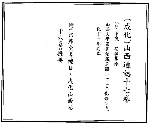 明成化版《山西通志》是山西省第一部省志,也是全国最早的省志之一,具有重要的史料价值。始修于成化七年(1471),十年(1474)成书,十一年(1475)付梓。记事止于九年(1473),唯名宦门载成化十二年差代理监法之陈鼎,当为初刻成书时补入。此书卷前有山西四境之图一卷。正文十七卷四十一门,附十一门。其分类与宋元方志相近,并列许多门类,结构比较松散。